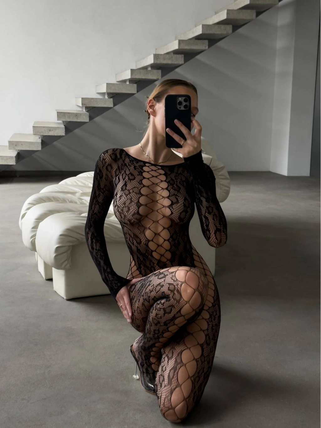 Kadın Siyah Geniş File Özel Bölgesi Açık Şık Fantezi Vücut Çorabı