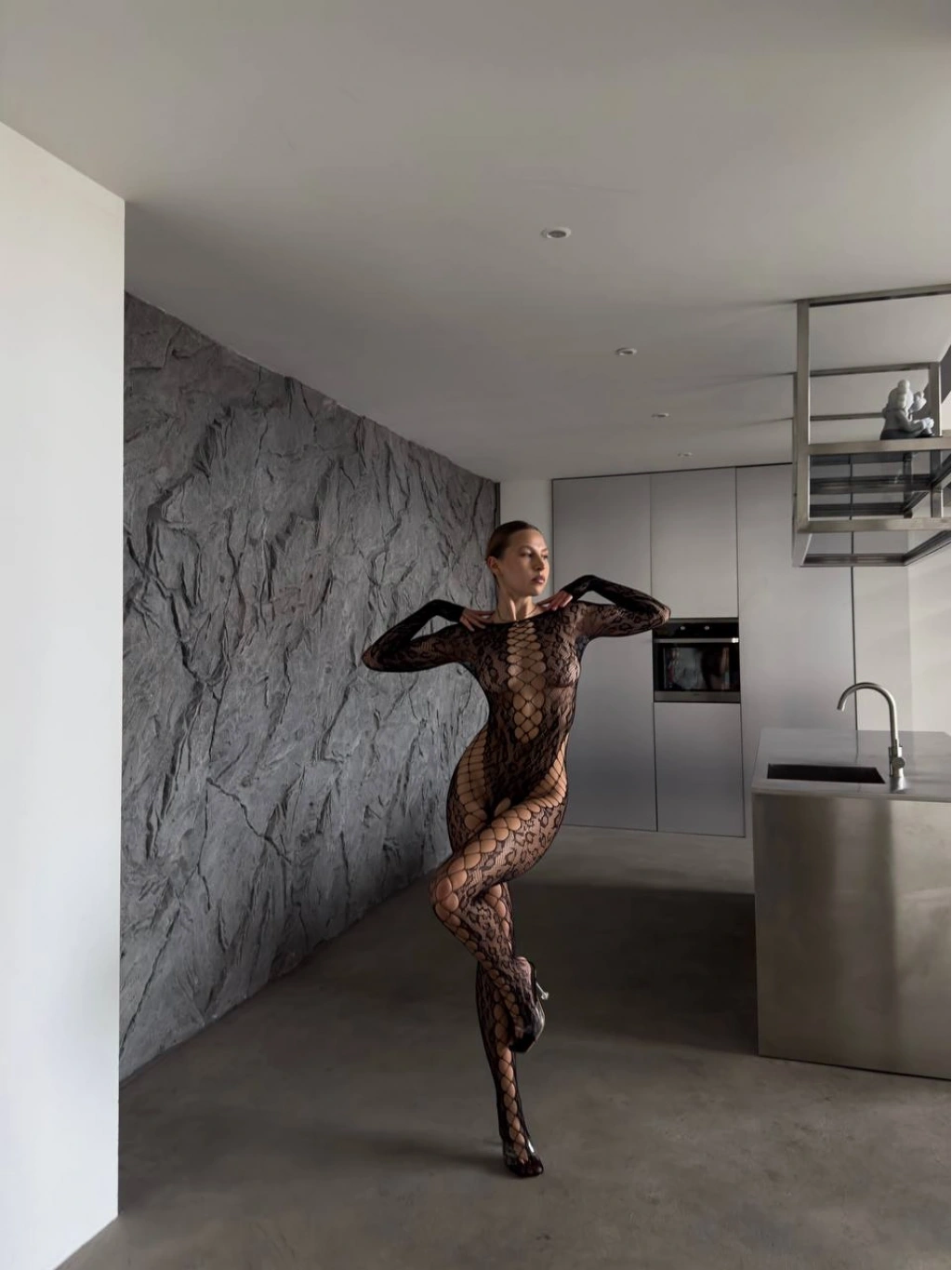 Kadın Leopar Özel Tasarım Eldivenli Vücut Çorabı